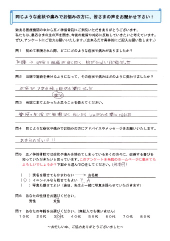 A.初診時に超音波等で細部まで調べていただき、小さな心配事にも丁寧に説明して下さったので、安心しました。運動を続けたかったので、治療をしながらどのように運動を再開すればいいかの相談もさせてもらいました。保険の事も詳しく教えて下さるので助かりました。