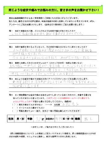 A.加齢と諦めずに根気よく続けることで痛みも和らぎ良くなりますので、継続が大切と思います。