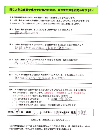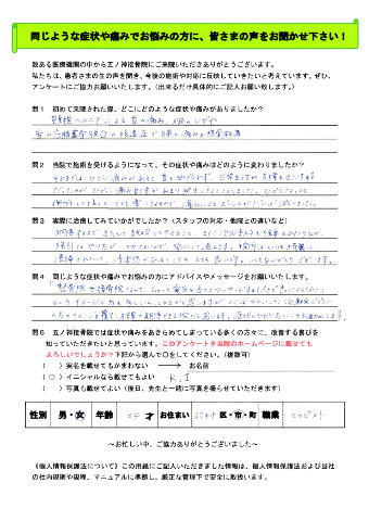 A.スタッフの方は皆さんあいさつしてくれますし、対応も早く気持ち良く利用させて頂いてます。Q.同じような症状や痛みでお悩みの方にアドバイスやメッセージをお願いいたします。