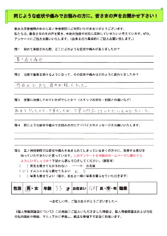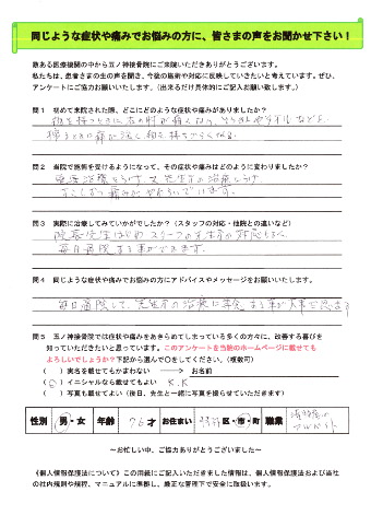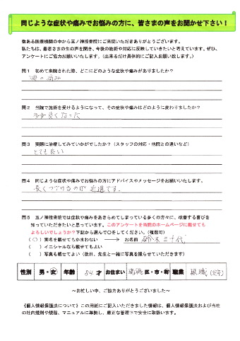 A.それまではひどい痛みがあると首も曲げられず、日常生活に支障をきたす程だったのが、ひどい痛み自体があまり発生しなくなりました。ひどくなっても施術して頂くととても楽になるので、痛みによるストレスがだいぶ減りました。