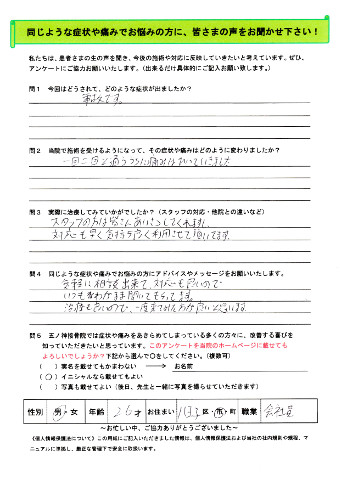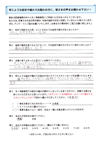 A.一回二回と通ううちに痛みはひいていきました。Q.実際に治療してみていかがでしたか?(スタッフの対応・他院との違いなど)
