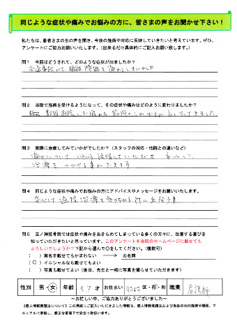 A.事故です。Q.当院で施術を受けるようになって、その症状や痛みはどのように変わりましたか?